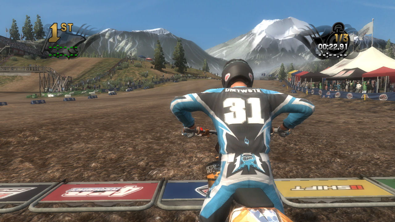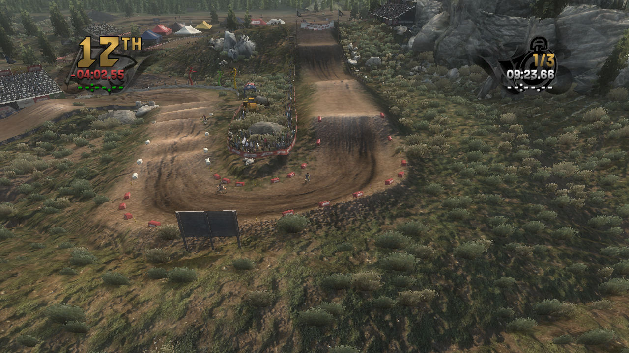 This is a great track to open up the National races. It's easy to ride but has several tricky sections that help you learn how to control your bike and rider. The first turn has a traction breaking bump and the first stretch is an easy rhythm section that will introduce you to the benefits of matching your bike's trajectory to the rhythm of the track. There are several turns that make you jump while turning and a nice big air finish where you can practice landing the big ones.
