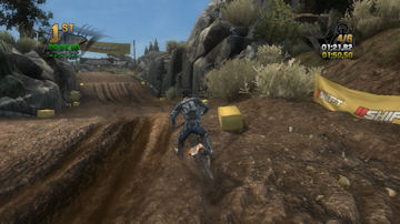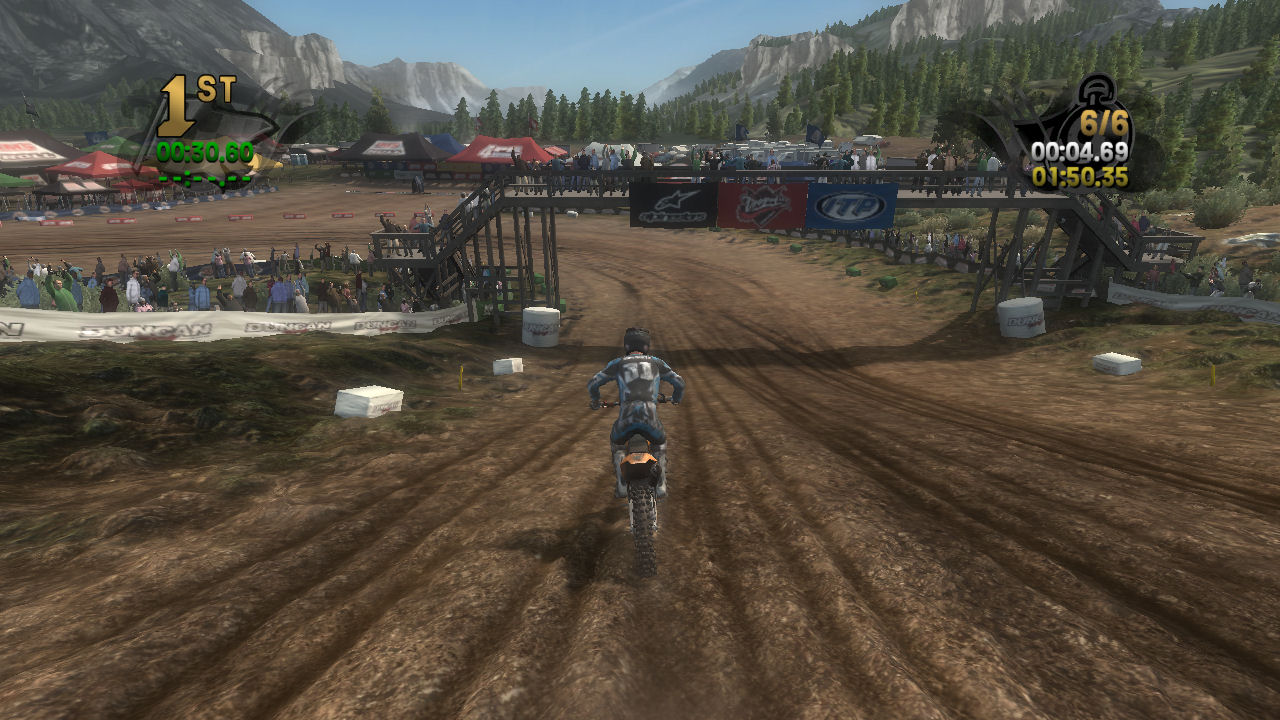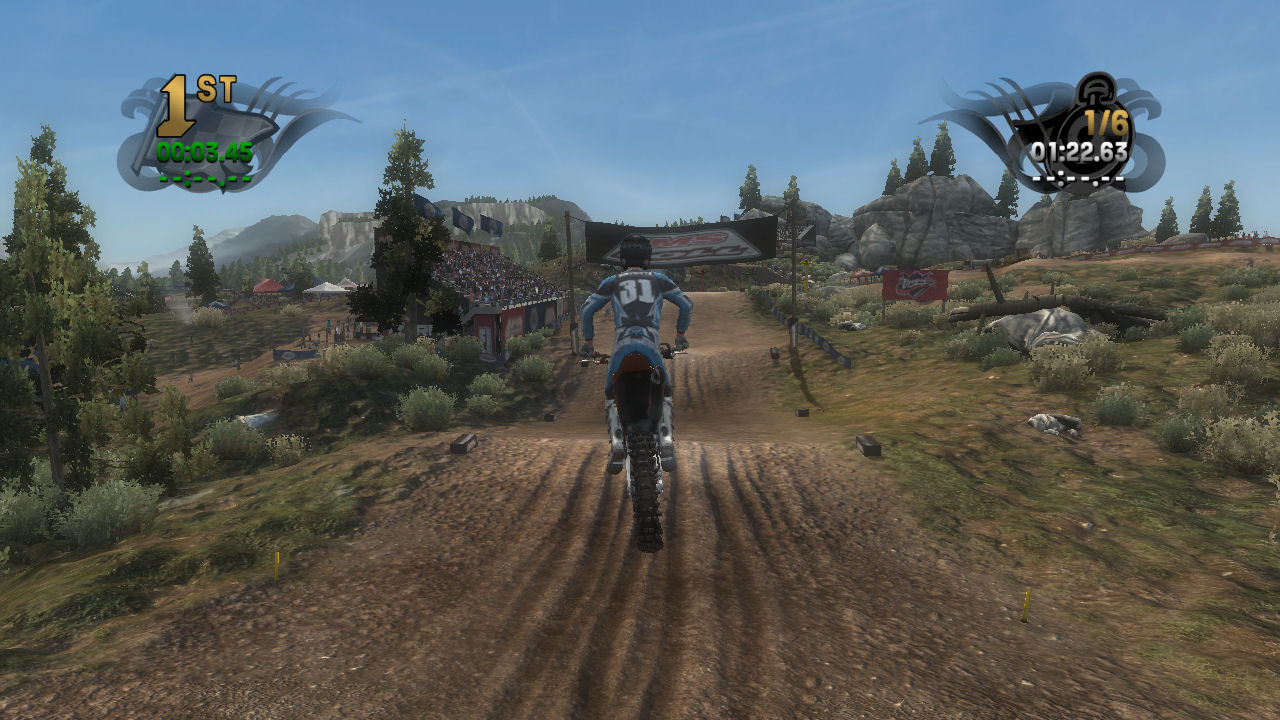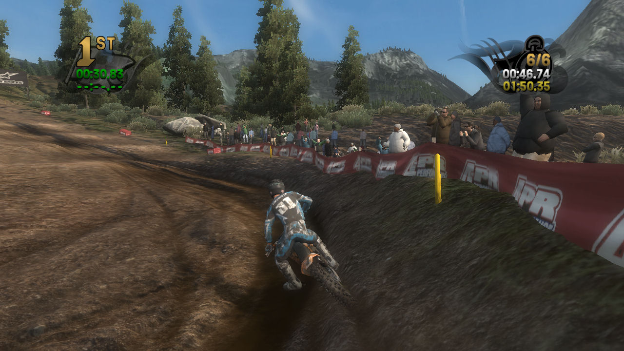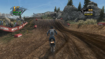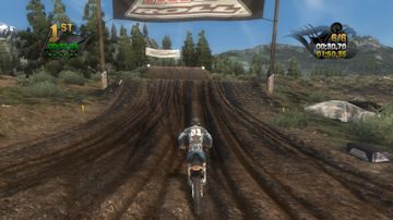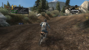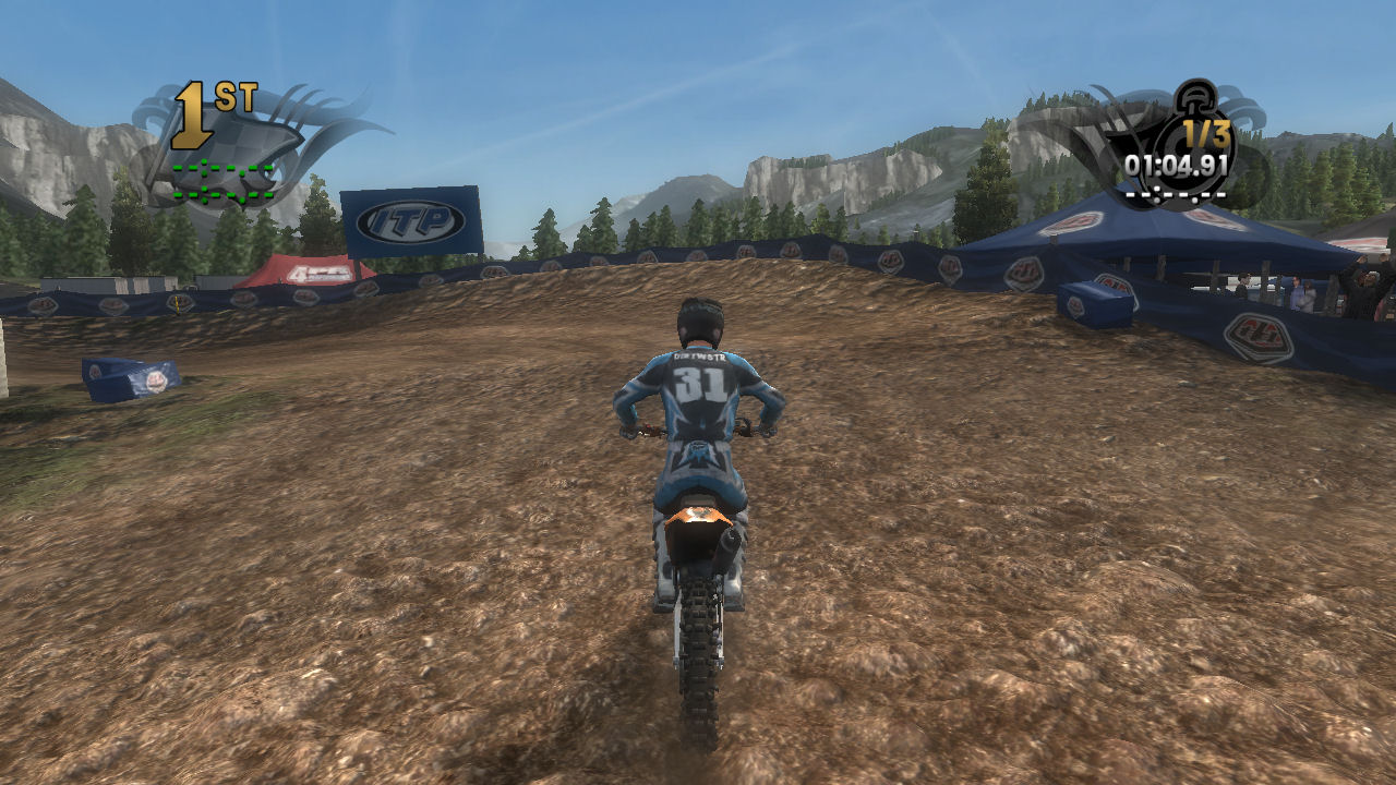If you take the time to putt around for a lap or two you will see that the tracks are already slightly rutted before anyone rides on them. The rutting that the tracks start with is almost as much as people that made tracks for Motocross Madness 2 (MCM 2) and MX vs ATV Unleashed (MVA) were rutting their tracks. The fact that they can do this and rut the track even more as each rider passes by while maintaining the control of the bike is quite an accomplishment. In MCM 2 when you rutted the track it didn't take much to make the bike act very oddly almost sticky and then it would be difficult to turn. The bike still reacts to the ruts, but it does it in a way where the rut feels like dirt and not concrete.