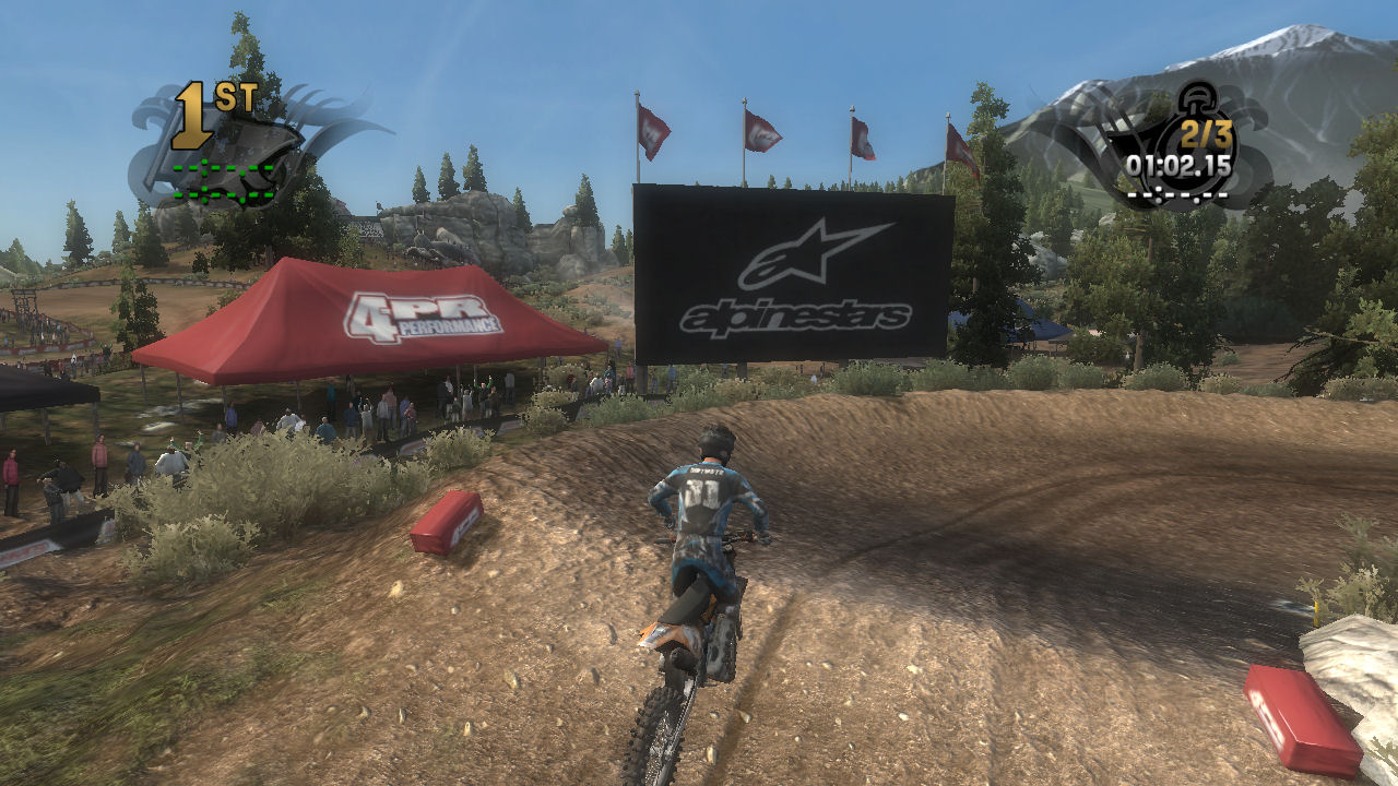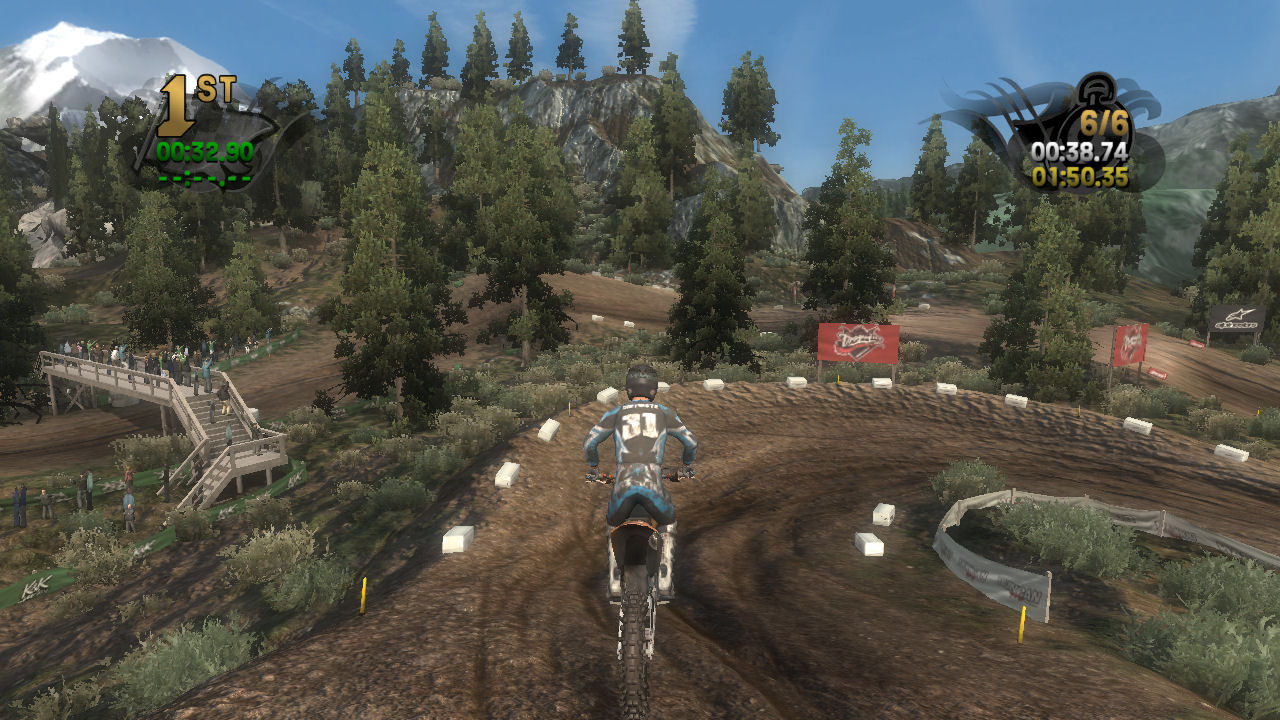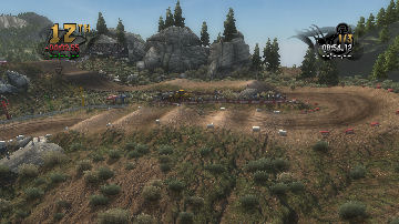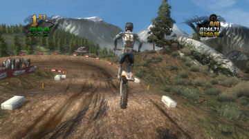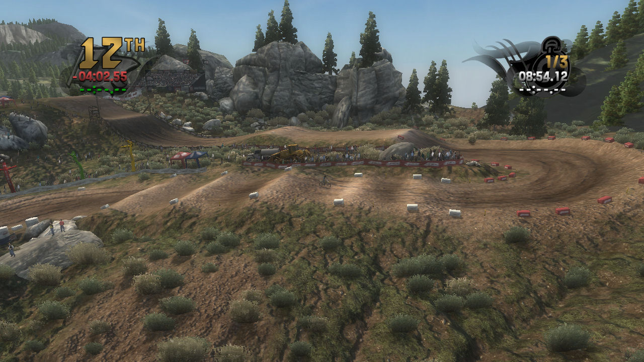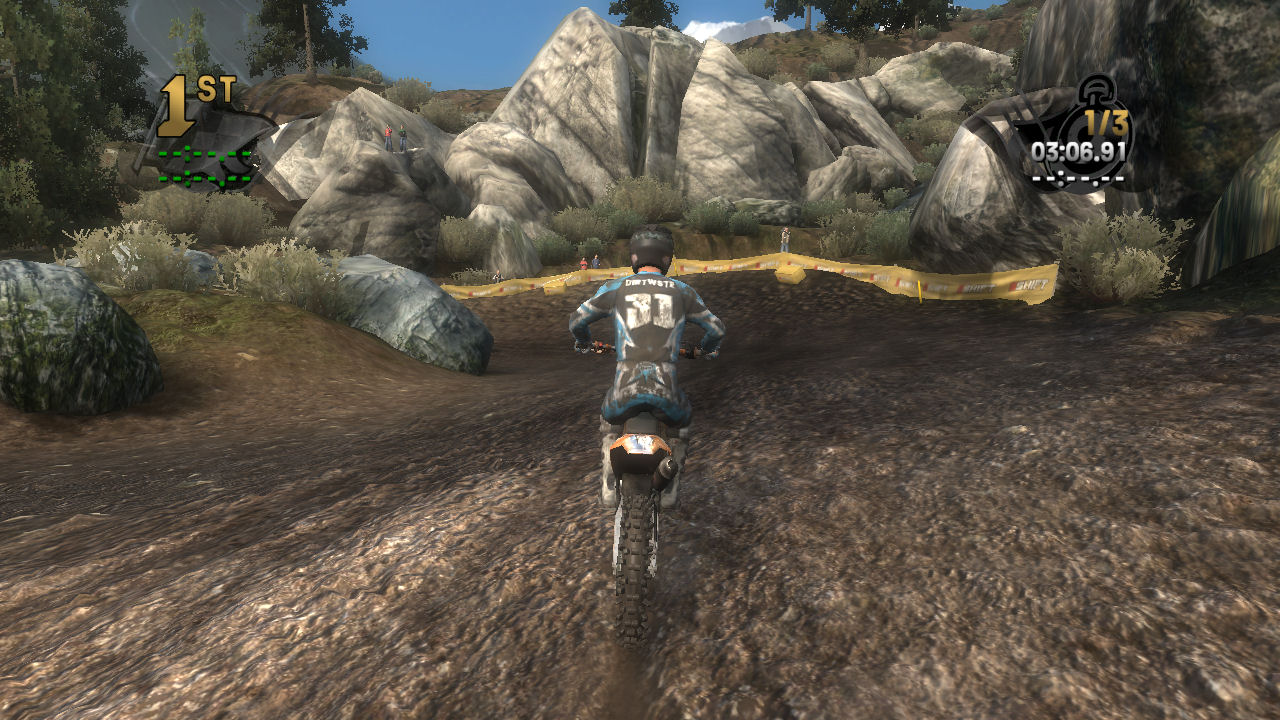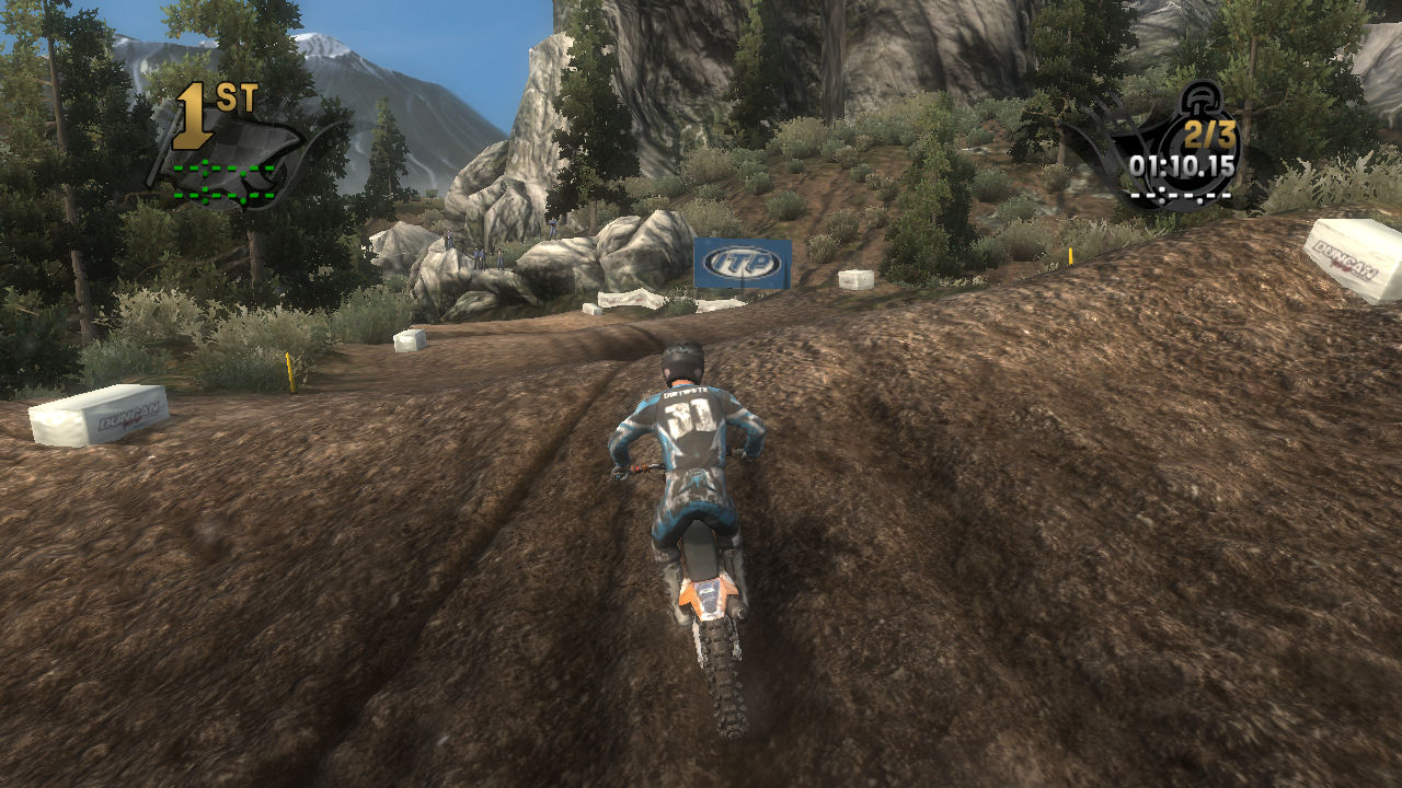 If you take the time to putt around for a lap or two you will see that the tracks are already slightly rutted before anyone rides on them. The rutting that the tracks start with is almost as much as people that made tracks for Motocross Madness 2 (MCM 2) and MX vs ATV Unleashed (MVA) were rutting their tracks. The fact that they can do this and rut the track even more as each rider passes by while maintaining the control of the bike is quite an accomplishment. In MCM 2 when you rutted the track it didn't take much to make the bike act very oddly almost sticky and then it would be difficult to turn. The bike still reacts to the ruts, but it does it in a way where the rut feels like dirt and not concrete.