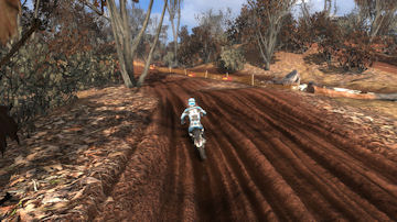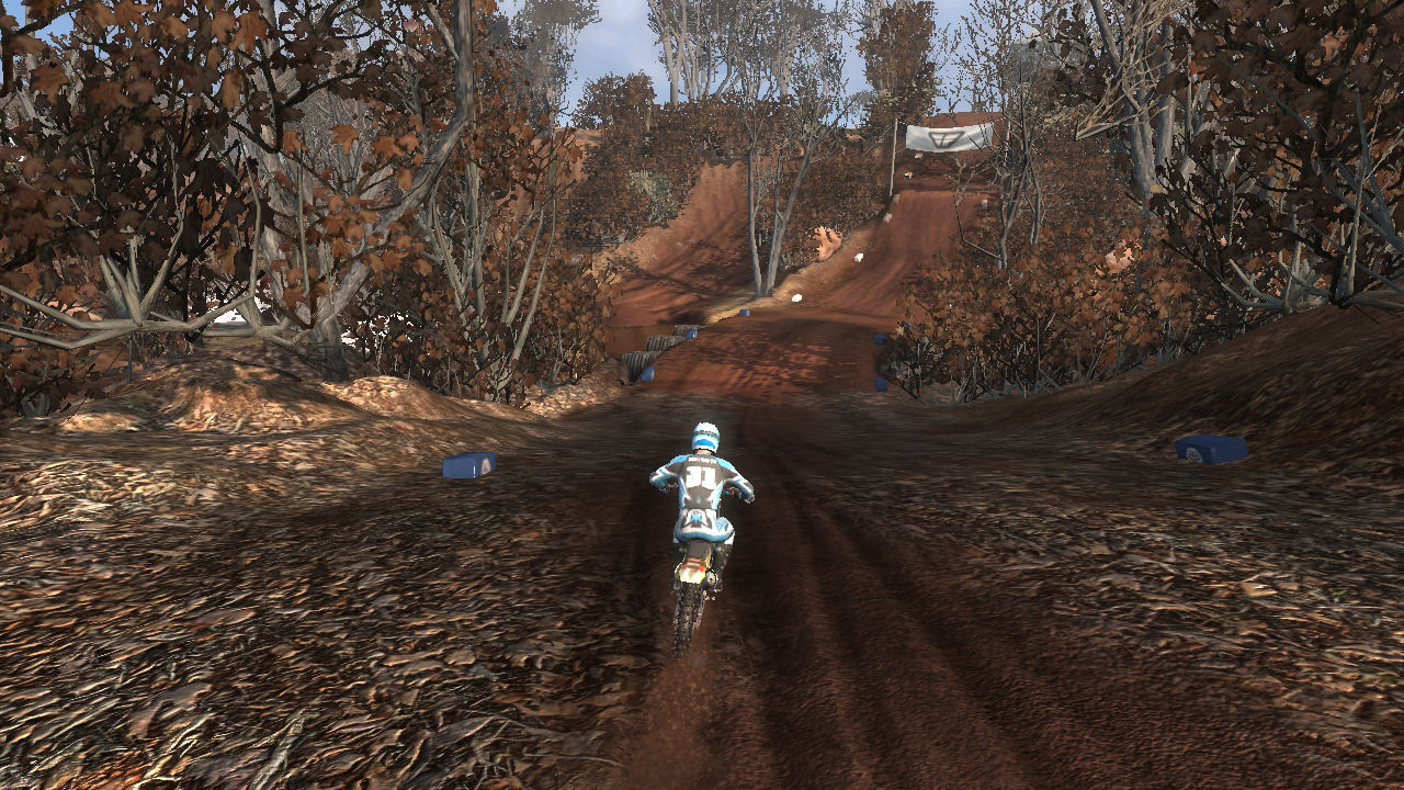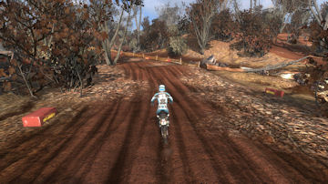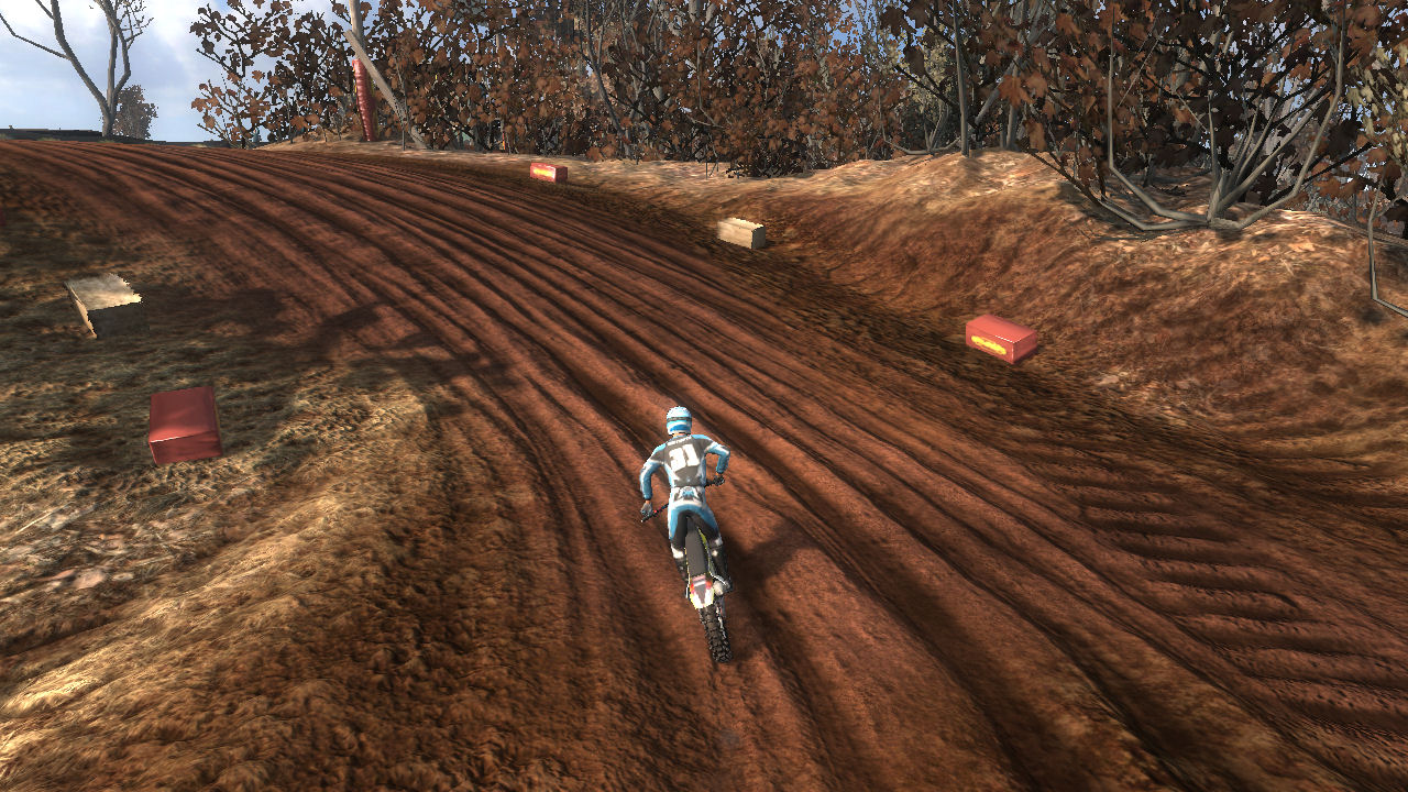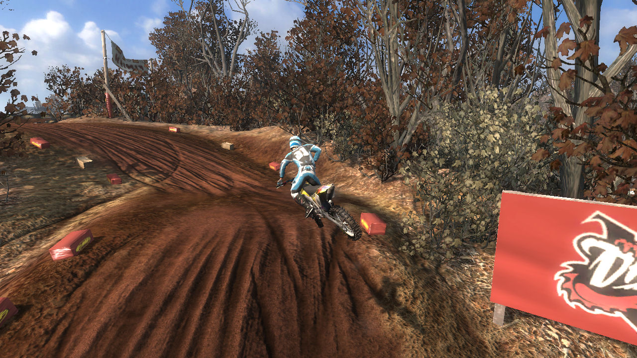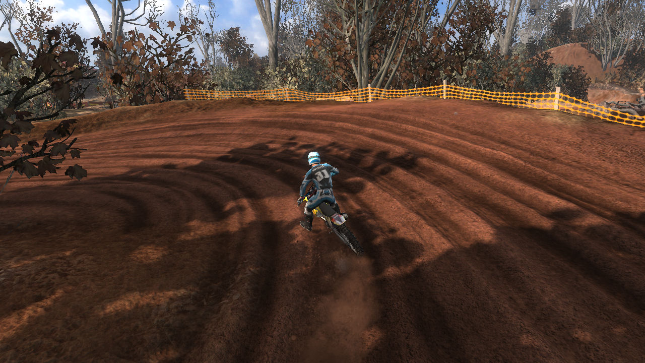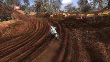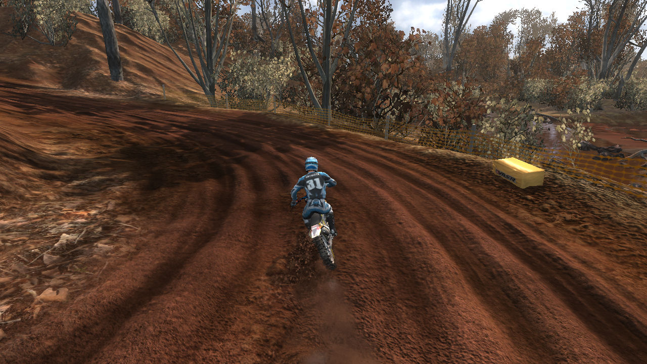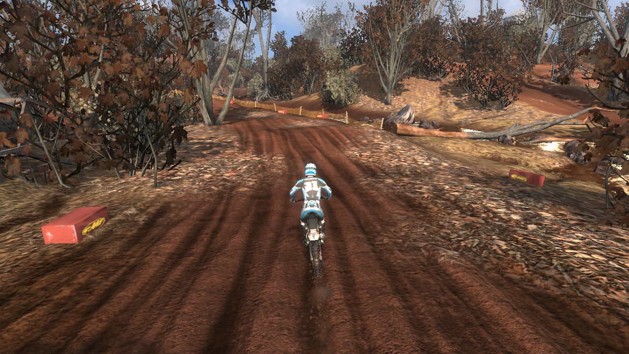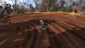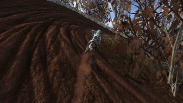 Turn 10 is a wonder 135 degree right hand turn, that you can just throw your bike in and slide around it. Even though it is a tight turn it is sharply banked and up on the side of a hill. Throw the bike in here, it will stick and blast out of the turn towards turn 11.