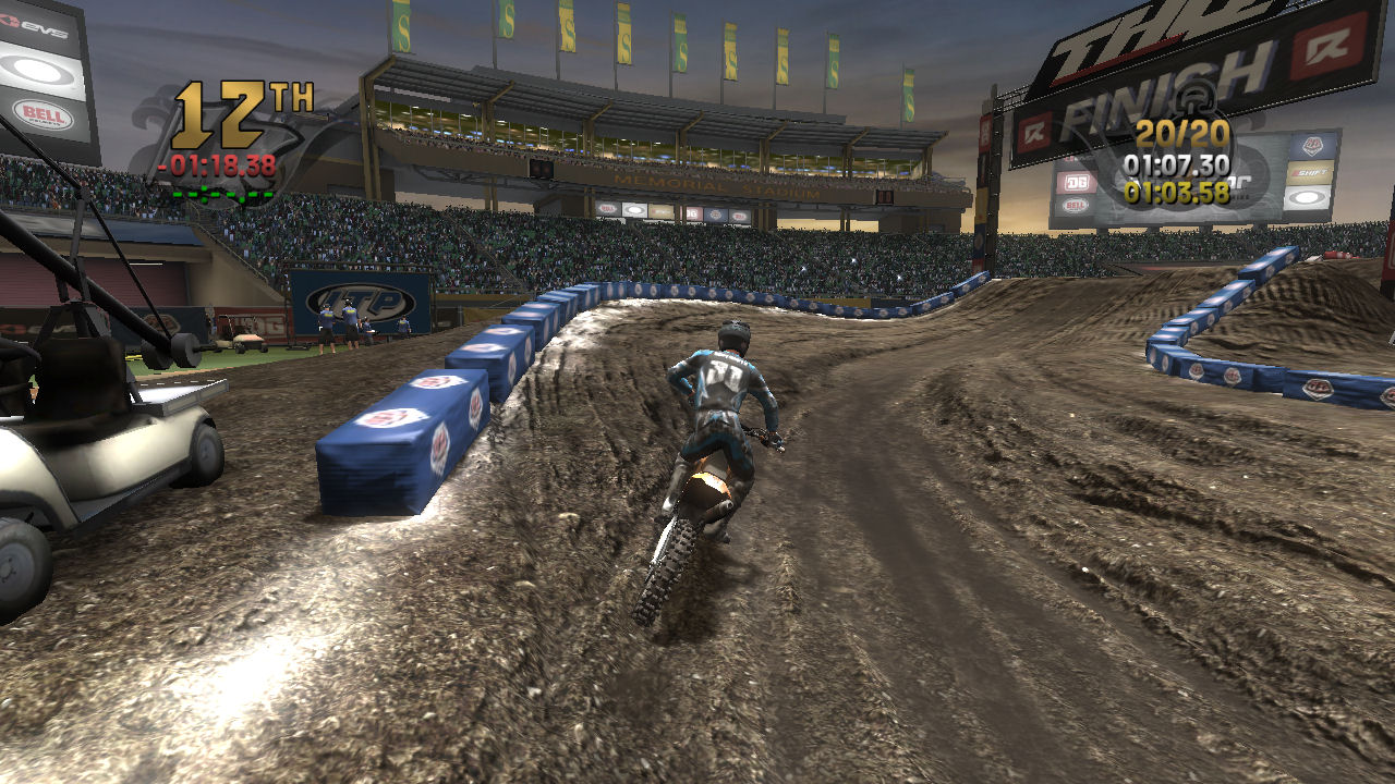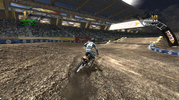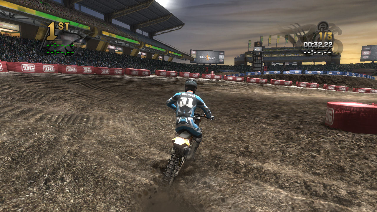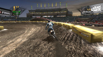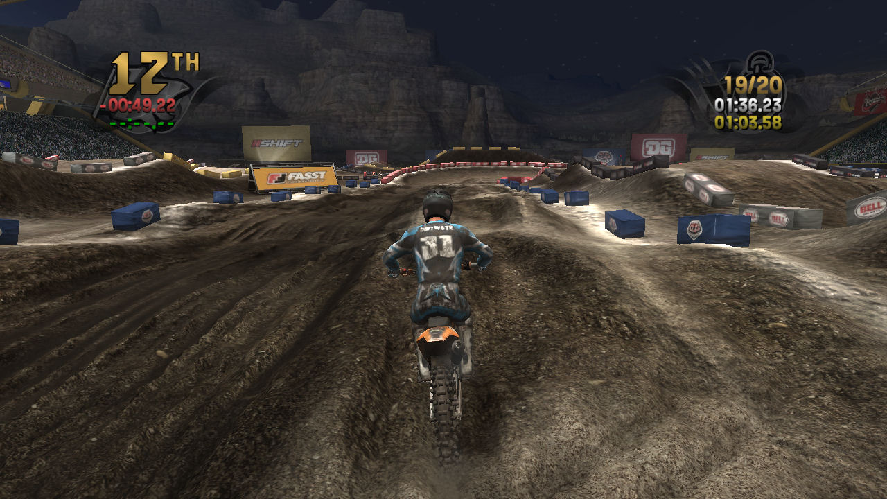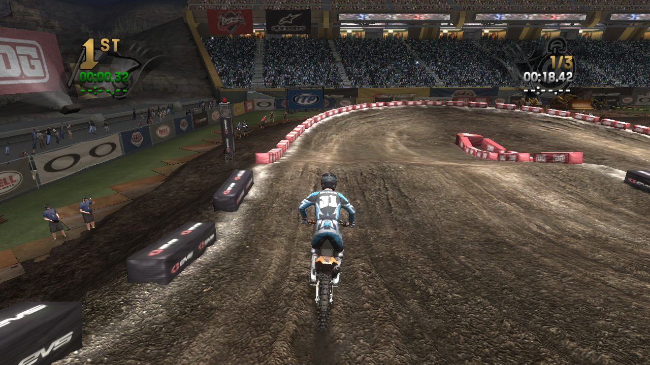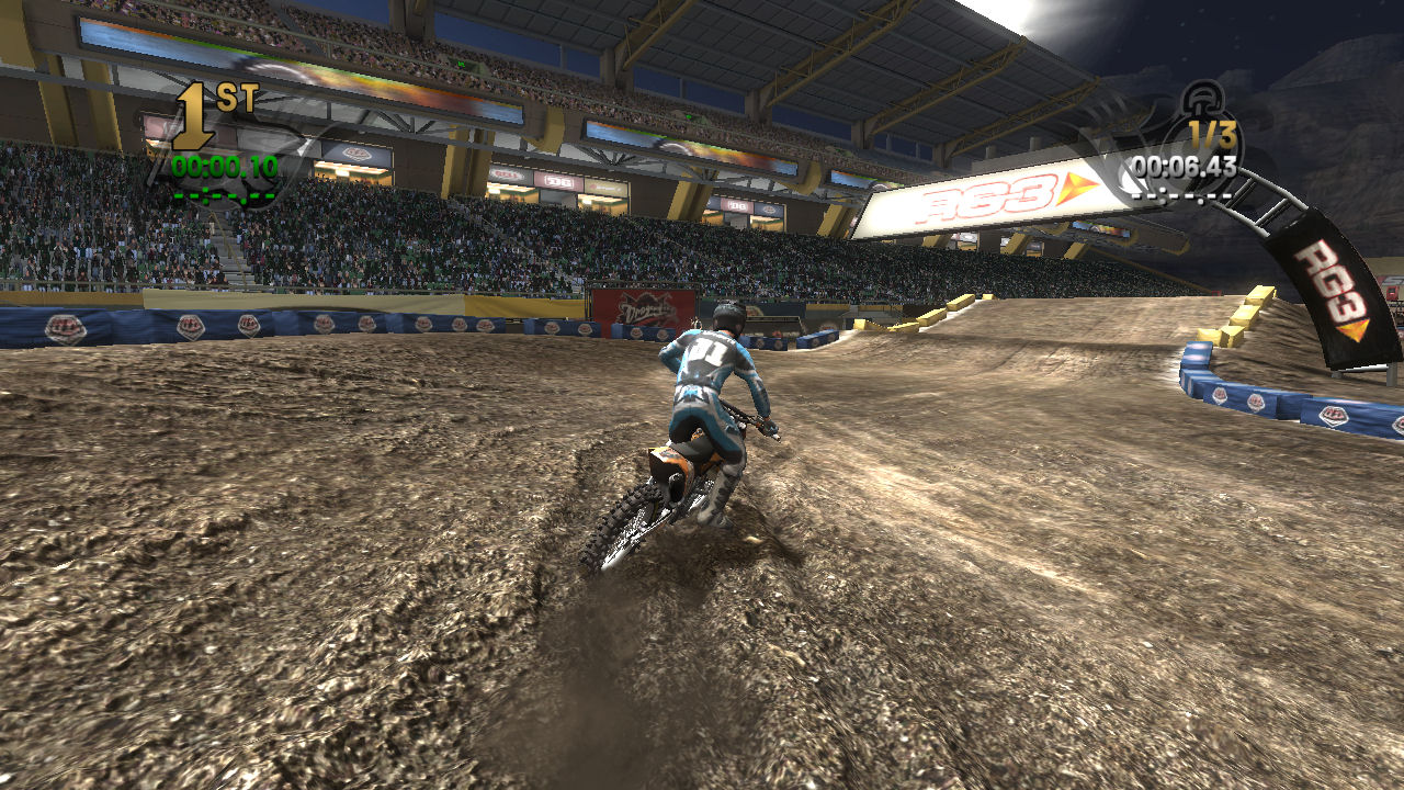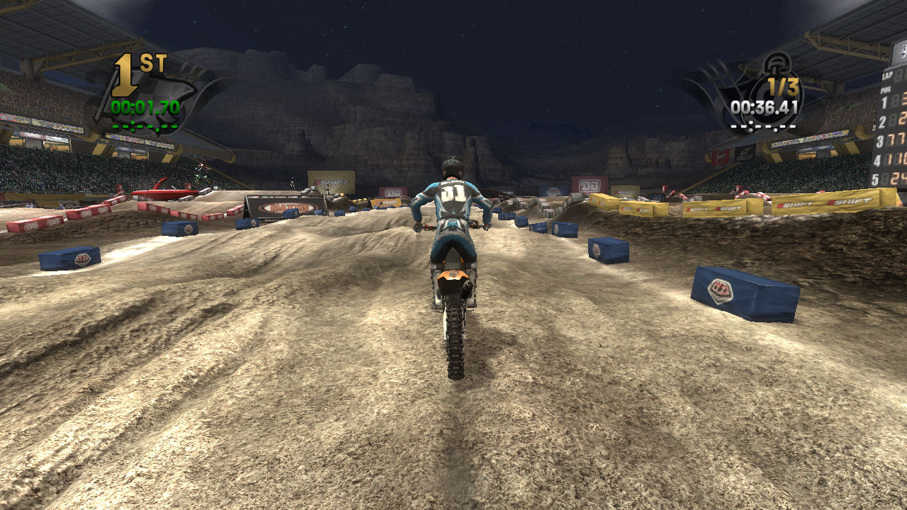 This track is the easiest of the SX tracks in Reflex, but don't let that fool you. Even easy becomes hard when racing against others. The faster the track, the more small mistakes cost you. This track has plenty of opportunities for small mistakes, from the kink in the first straight that may put you in the Tuff Blocks when you land the triple, the super sandy straight after turn 6, the long whoop section after turn 8 followed by a big triple into another kink. to finally the extremely tricky turn 11 that leads you into the finish line jump.