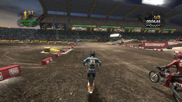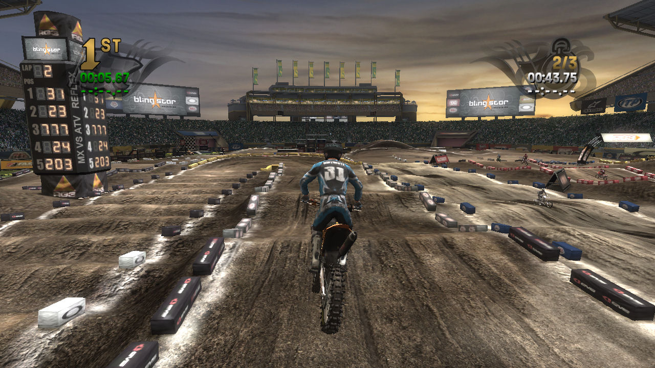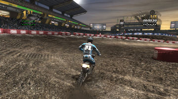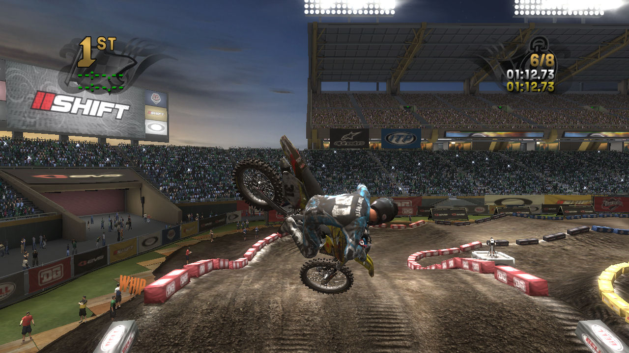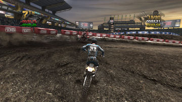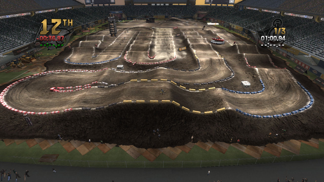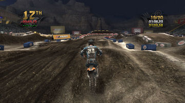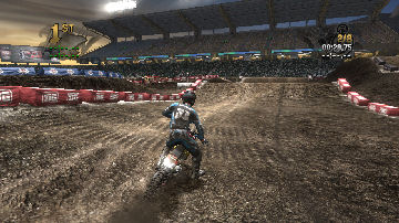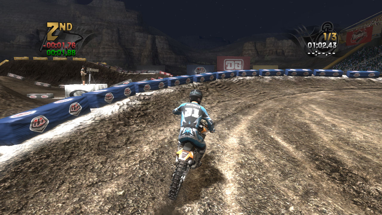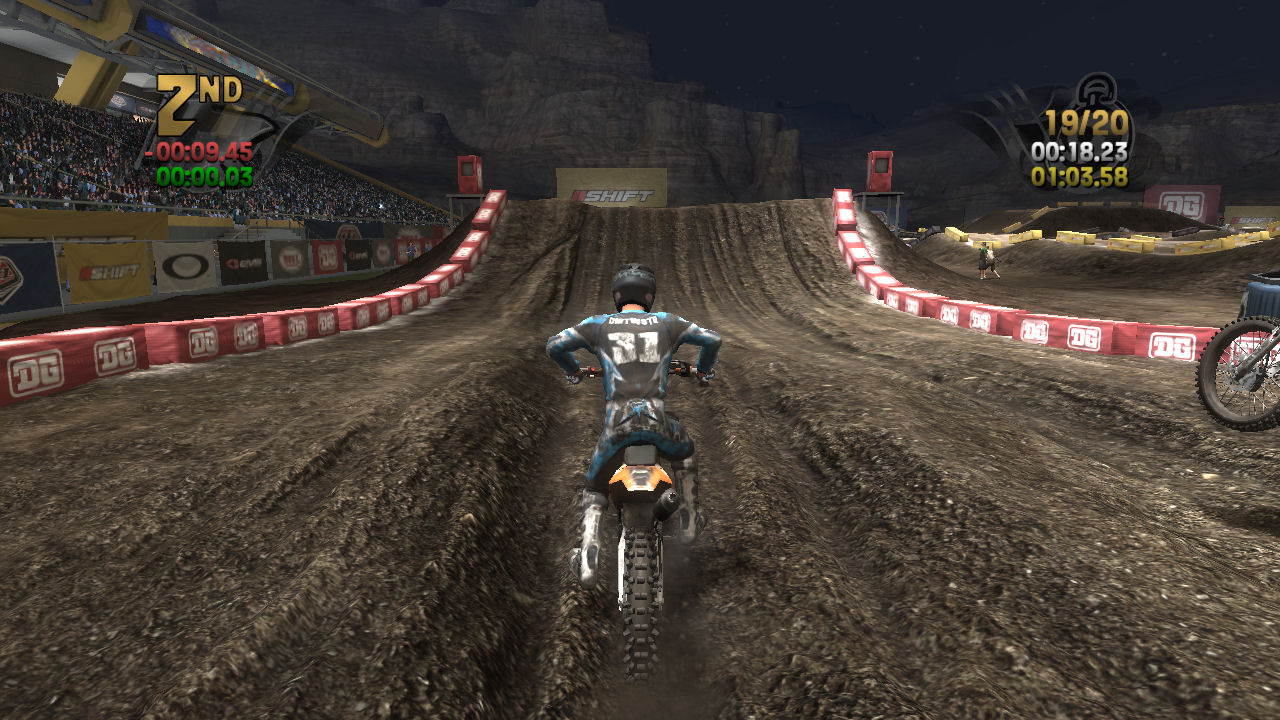 This track is the easiest of the SX tracks in Reflex, but don't let that fool you. Even easy becomes hard when racing against others. The faster the track, the more small mistakes cost you. This track has plenty of opportunities for small mistakes, from the kink in the first straight that may put you in the Tuff Blocks when you land the triple, the super sandy straight after turn 6, the long whoop section after turn 8 followed by a big triple into another kink. to finally the extremely tricky turn 11 that leads you into the finish line jump.
