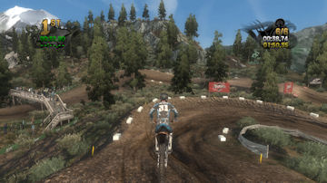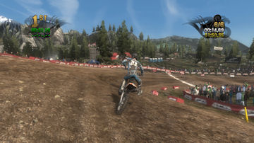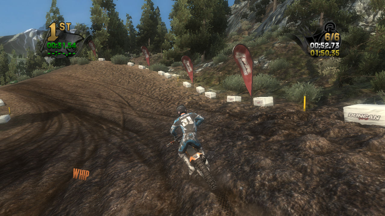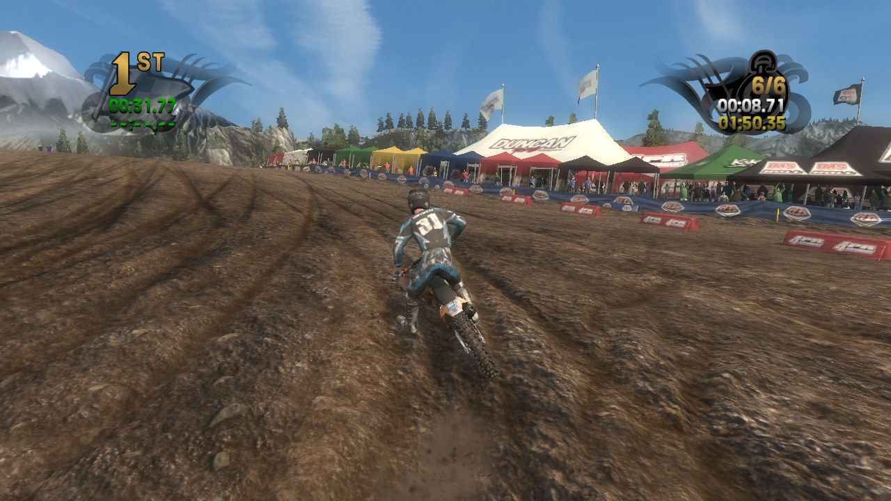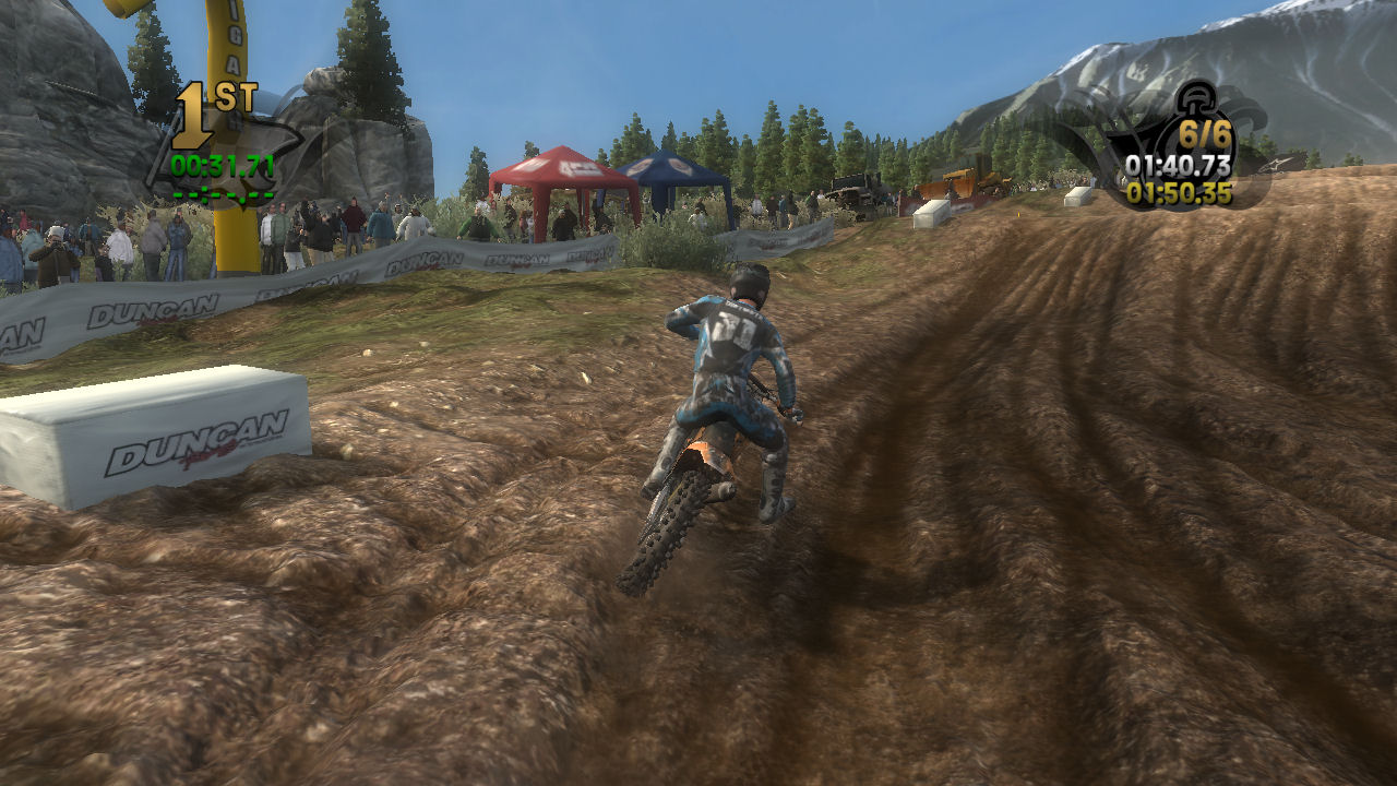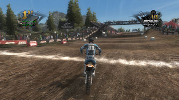 If you take the time to putt around for a lap or two you will see that the tracks are already slightly rutted before anyone rides on them. The rutting that the tracks start with is almost as much as people that made tracks for Motocross Madness 2 (MCM 2) and MX vs ATV Unleashed (MVA) were rutting their tracks. The fact that they can do this and rut the track even more as each rider passes by while maintaining the control of the bike is quite an accomplishment. In MCM 2 when you rutted the track it didn't take much to make the bike act very oddly almost sticky and then it would be difficult to turn. The bike still reacts to the ruts, but it does it in a way where the rut feels like dirt and not concrete.