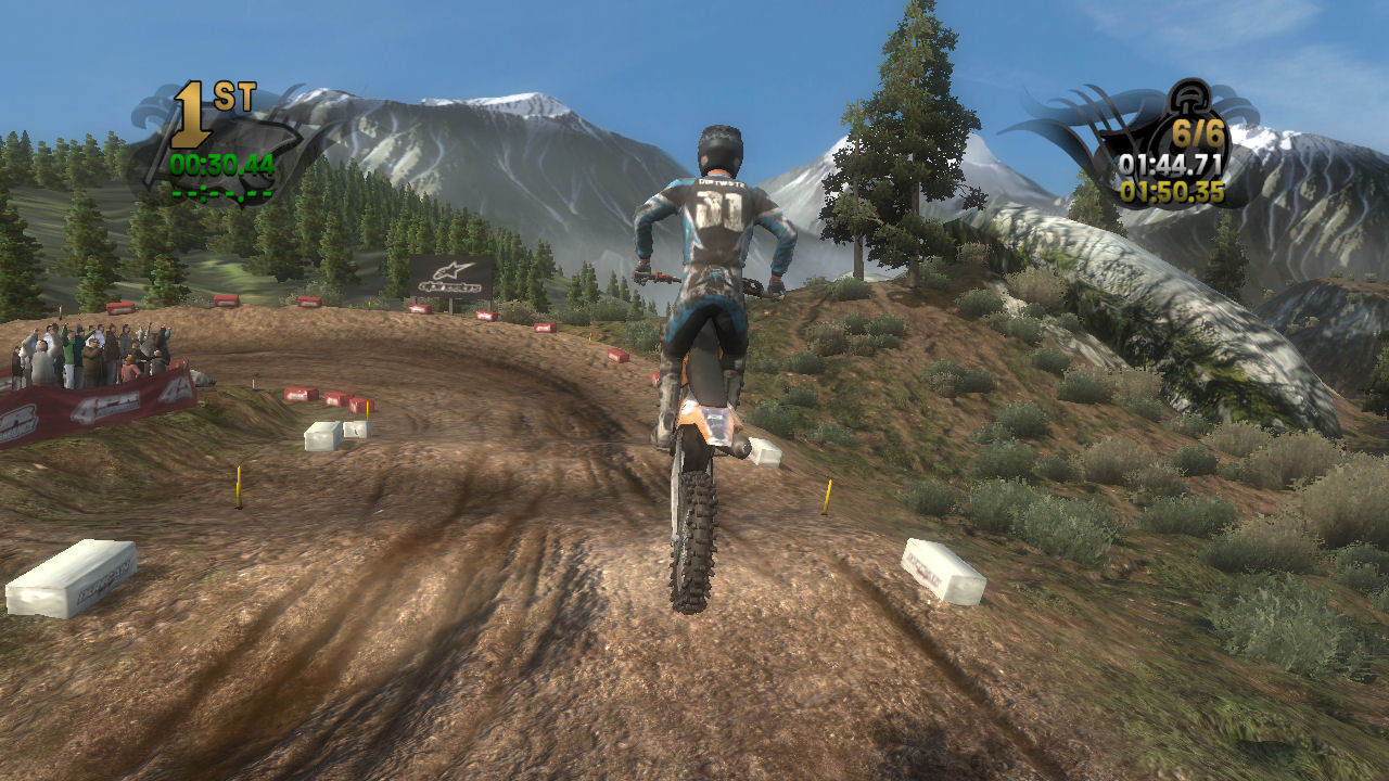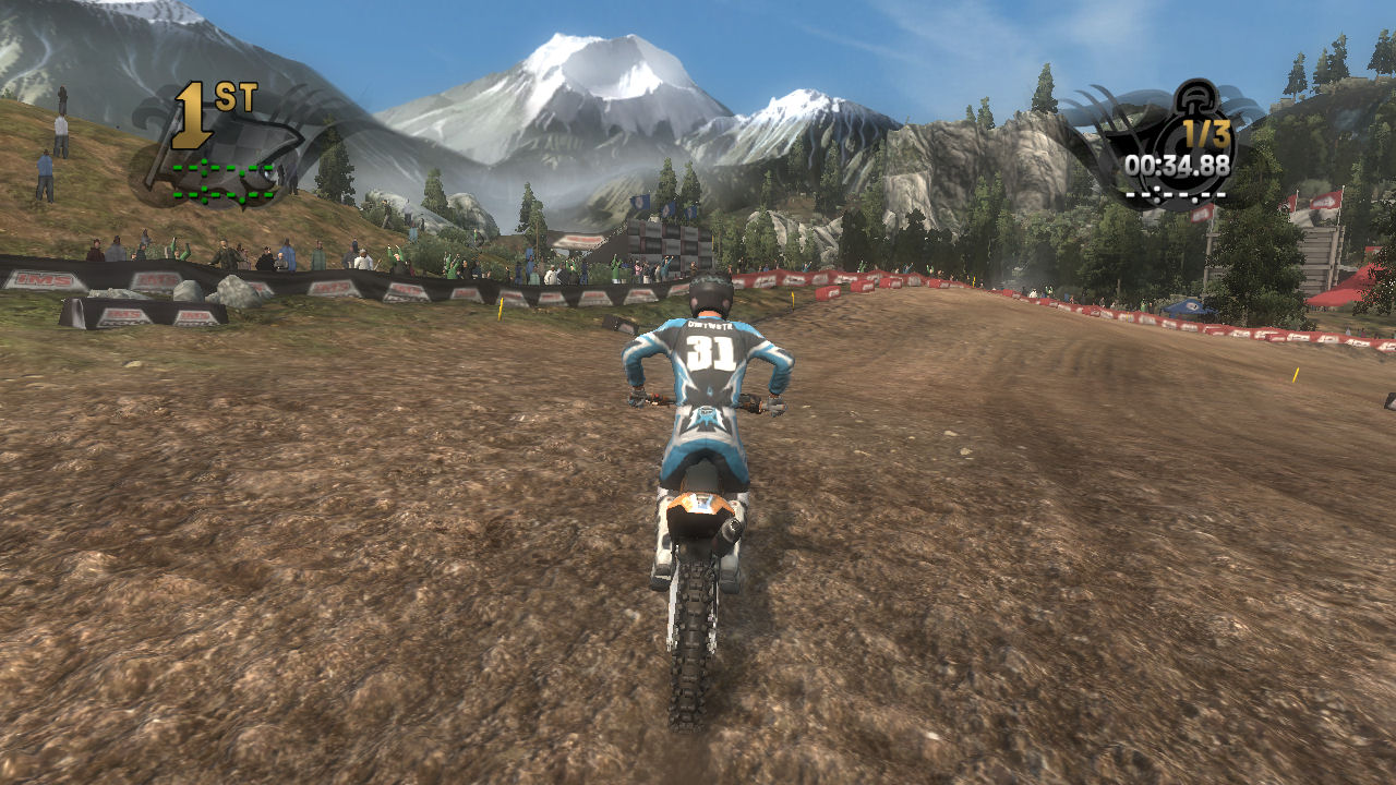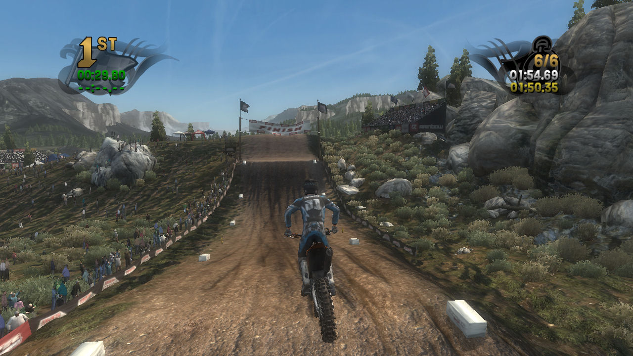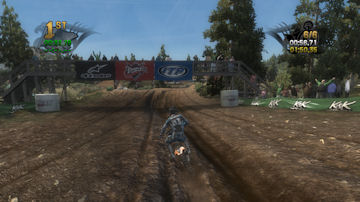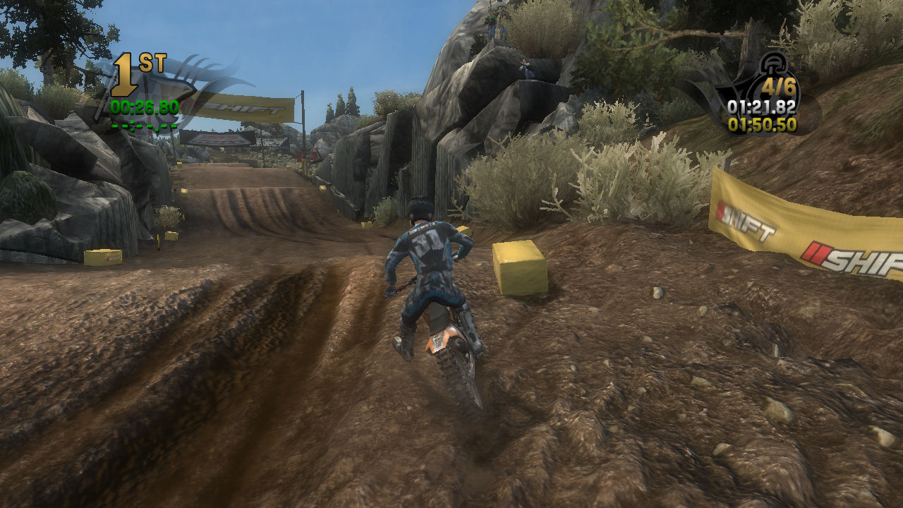 If you take the time to putt around for a lap or two you will see that the tracks are already slightly rutted before anyone rides on them. The rutting that the tracks start with is almost as much as people that made tracks for Motocross Madness 2 (MCM 2) and MX vs ATV Unleashed (MVA) were rutting their tracks. The fact that they can do this and rut the track even more as each rider passes by while maintaining the control of the bike is quite an accomplishment. In MCM 2 when you rutted the track it didn't take much to make the bike act very oddly almost sticky and then it would be difficult to turn. The bike still reacts to the ruts, but it does it in a way where the rut feels like dirt and not concrete.