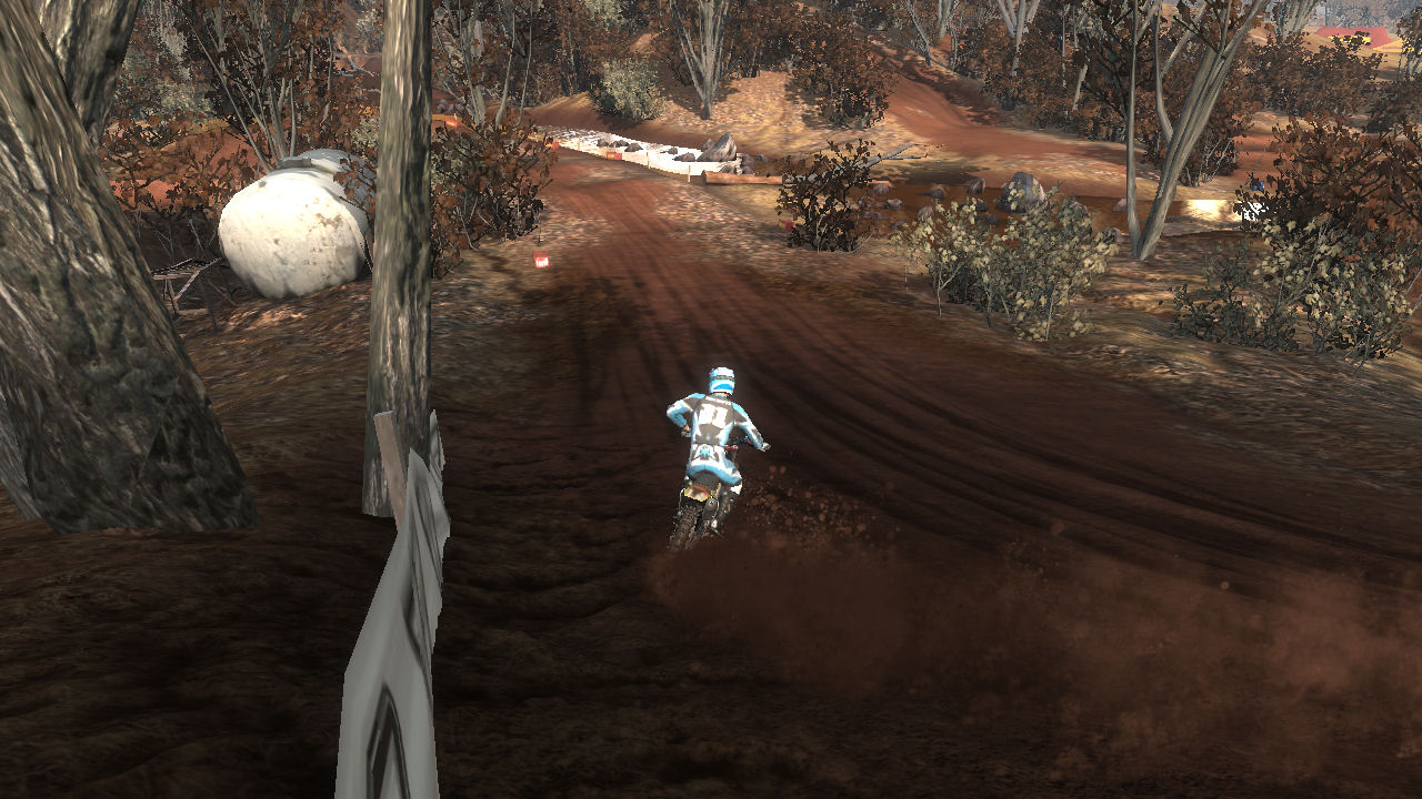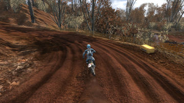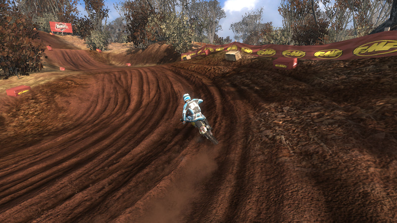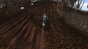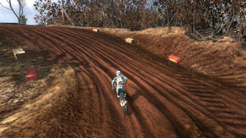 Turn 10 is a wonder 135 degree right hand turn, that you can just throw your bike in and slide around it. Even though it is a tight turn it is sharply banked and up on the side of a hill. Throw the bike in here, it will stick and blast out of the turn towards turn 11.