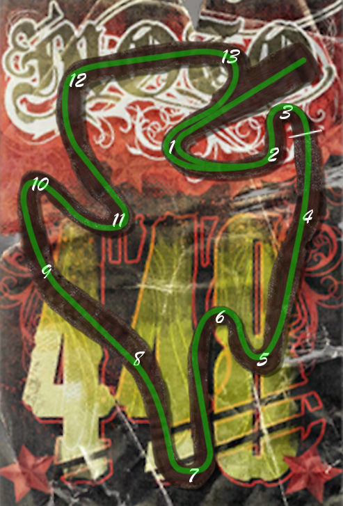 Turn 13 - No matter how you land coming into 13, you want to cut this turn and be on the right side as you exit going back into turn 1.