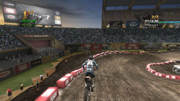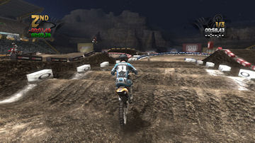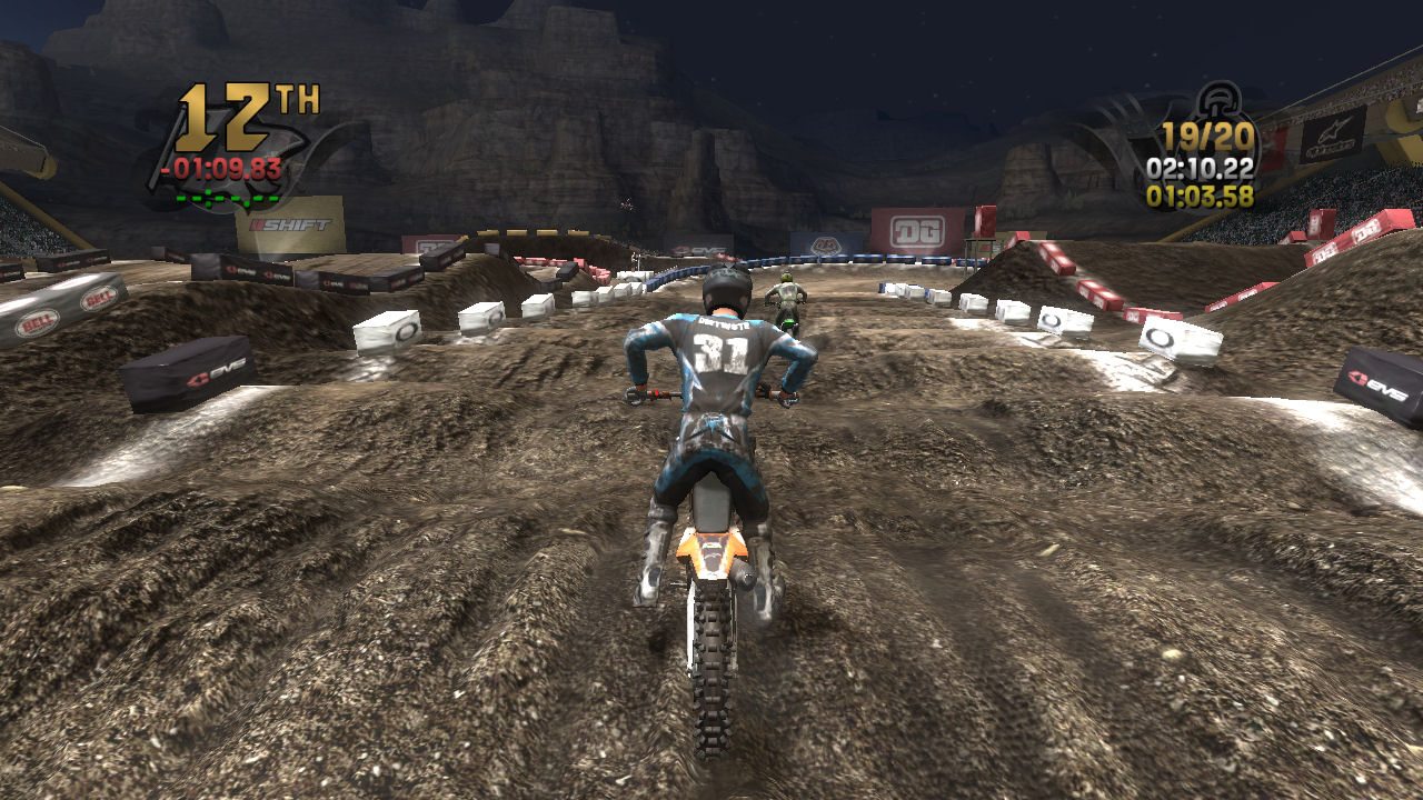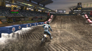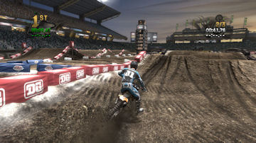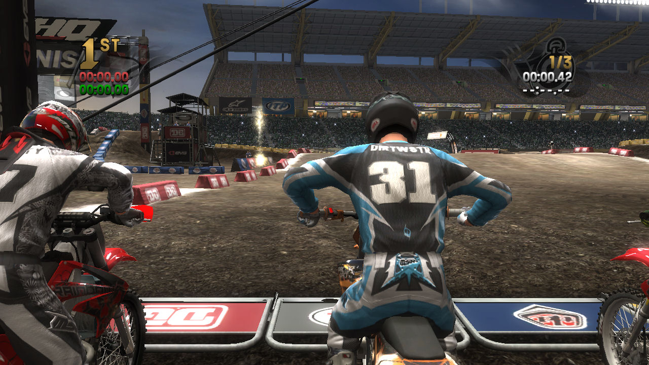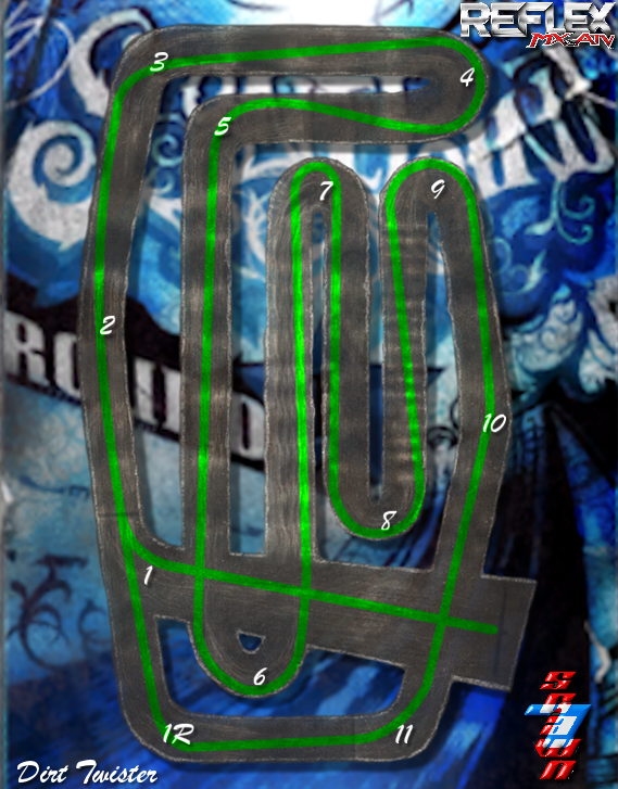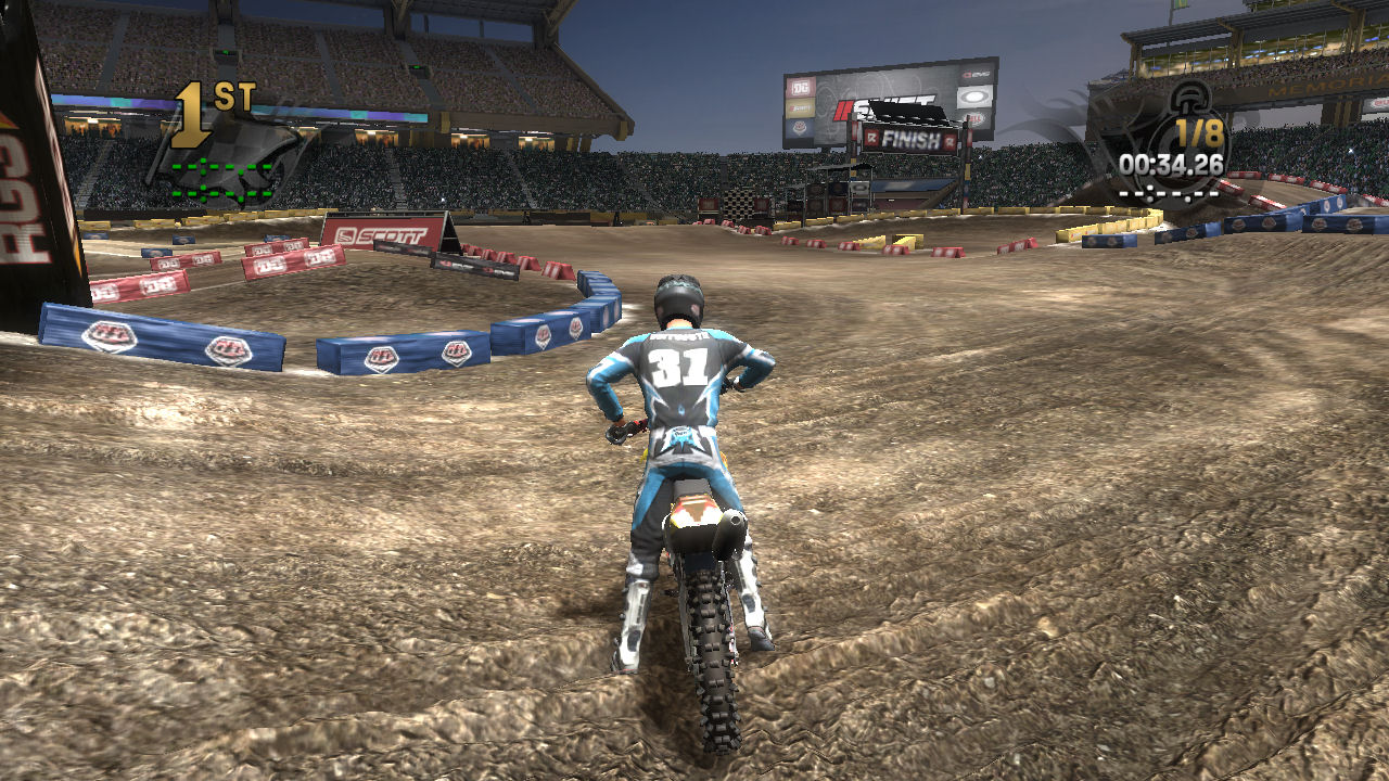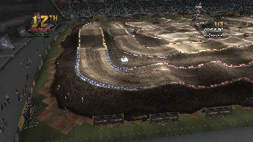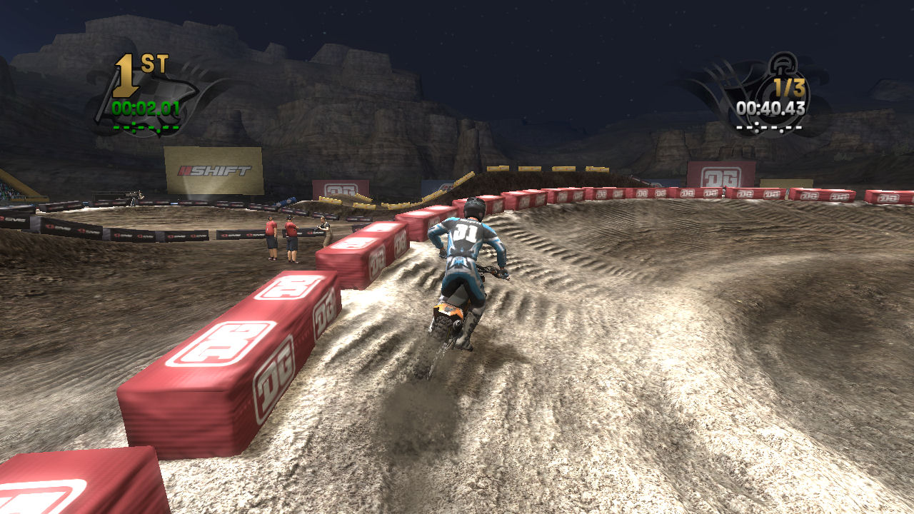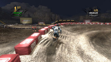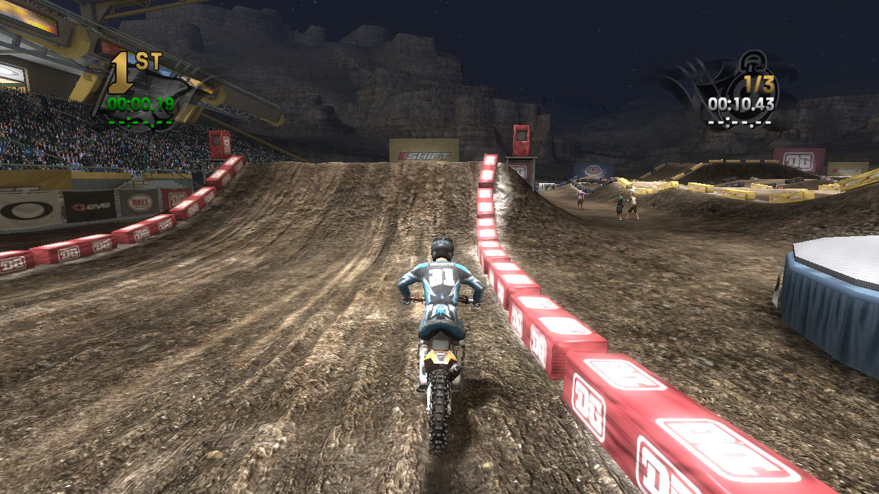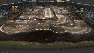 This track is the easiest of the SX tracks in Reflex, but don't let that fool you. Even easy becomes hard when racing against others. The faster the track, the more small mistakes cost you. This track has plenty of opportunities for small mistakes, from the kink in the first straight that may put you in the Tuff Blocks when you land the triple, the super sandy straight after turn 6, the long whoop section after turn 8 followed by a big triple into another kink. to finally the extremely tricky turn 11 that leads you into the finish line jump.